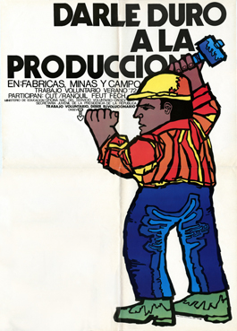 9350 – DARCI SOTTO CON LA PRODUZIONE / NELLE FABBRICHE, NELLE MINIERE E NEI CAMPI, manifesto, Cile - Ministerio de educacion- Oficina nacional del servicio voluntario, [gennaio-febbraio] 1972